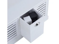 – Le banc est fabriquĂ© en panneaux de fibres de bois de moyenne densitĂ© et les tiroirs sont en bois de paulownia, l’ensemble est de finition blanc mat.