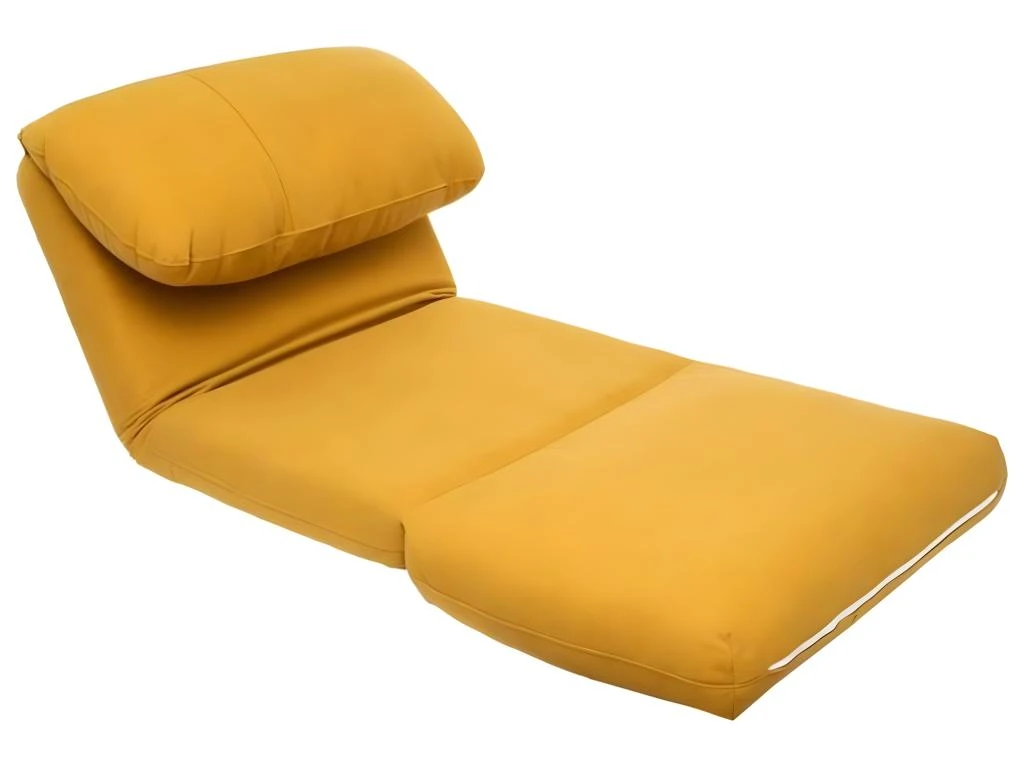 Enveloppe en tissu et coussin garni de coton. Assise d’une hauteur de 26 cm. Se déplie pour former un lit 209 x 78 x 58 cm, convenant pour un adulte ou un enfant.