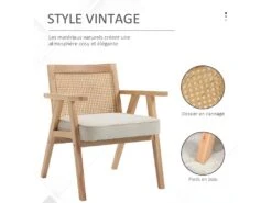 – Fauteuil lounge avec structure en bois d’hĂ©vĂ©a, dossier en cannage et coussin aspect lin beige idĂ©al pour plonger votre intĂ©rieur dans une atmosphĂšre exotique
