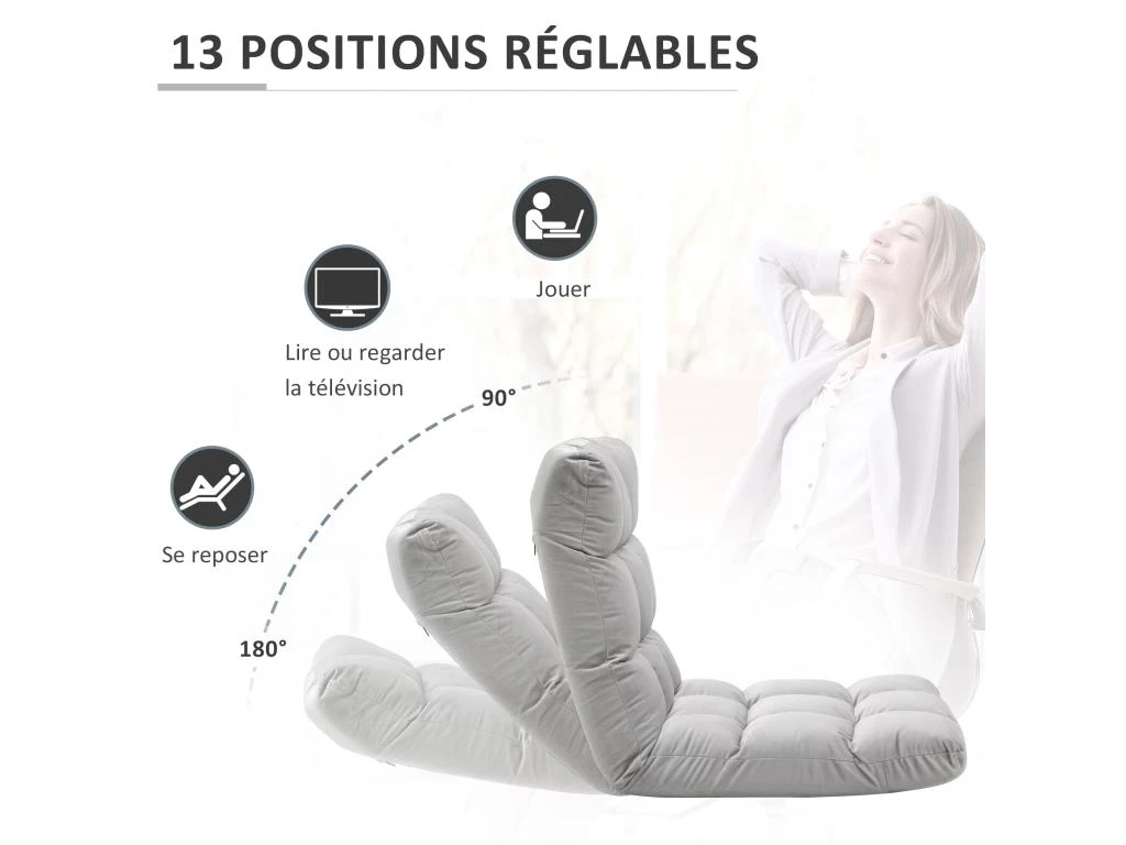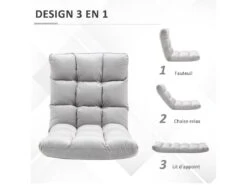 – Grande polyvalence, fauteuil convertible multipositions, dossier inclinable de 90° jusqu’à 180° vous permettant de l’utiliser en tant que fauteuil, chaise longue ou même lit d’appoint