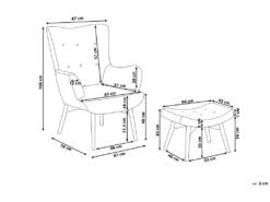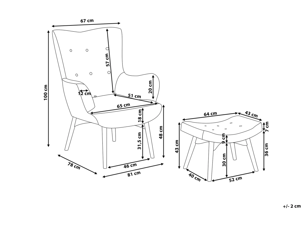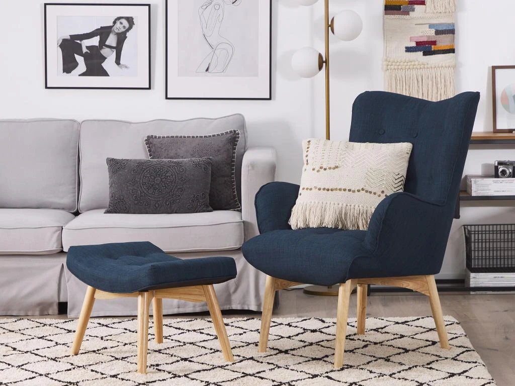 Fauteuil avec repose-pieds en tissu haut de gamme. Ce fauteuil en tissu de haute qualité complété de son repose-pieds vous offrira une expérience unique de relaxation. Extrêmement confortable grâce à son assise moelleuse, ses accoudoirs rembourrés et son dossier capitonné, ce fauteuil est idéal pour les moments de détente à la maison. Le siège et le repose-pieds se composent d’un revêtement en tissu très résistant, agréable au toucher et facile à entretenir. Les pieds eux sont en bois d’hévéa pour assurer une bonne stabilité. Le design rétro et la couleur sobre font l’élégance de ce fauteuil qui s’intégrera aussi bien dans un intérieur contemporain que dans un intérieur à la décoration plus classique. Charge maximale admissible: fauteuil 160 kg, repose pied 130 kg. Détails: Type de produit: Fauteuil Style: Scandinave Couleur principale: Bleu Nuance: Bleu foncé Type de matière: Tissu Matière principale: Polyester Matière secondaire: Bois d’hévéa Matière du rembourrage: Rembourrage en mousse Matière du piétement: Bois solide Matière de l`assise: Tissu Composition de la matière: 100% Polyester Style des accoudoirs: Encastré Accoudoirs: Oui Repose-pieds: Oui Patins pour pieds: Oui Motif: Unicolore Inclinable: Non Construction du siège: Ressorts de torsion Densité de la mousse du siège: 28 kg/m3 Dimensions: Dimensions des accoudoirs: 68 cm Profondeur: 78 cm Dimensions du pouf ottoman : 64x43x43 cm Épaisseur du siège: 18 cm Hauteur du siège: 48 cm Largeur: 81 cm Hauteur: 100 cm Surface d`assise: 65×51 cm Poids: 22 kg Charge admise: 130 kg L`offre inclue: 1 x Fauteuil, 1 x Tabouret Caractéristiques clés: Très confortable, Garantie du meilleur confort d’assise, Style rétro, Capitonnage décoratif, Rembourrage de qualité supérieure Informations d`assemblage: Préassemblé. 20 – 40 min Conseils de maintenance: Polyester: 1. Nettoyez avec un shampooing sec ou une éponge humide et un nettoyant doux 2. Aspirez en utilisant l’embout approprié. Bois d’hévéa: 1.Nettoyez avec un chiffon et un nettoyant doux dans le sens du grain du bois 2.De temps en temps, il est conseillé de mettre une nouvelle couche d’huile sur les meubles avec une finition huilée 3.Essuyez immédiatement après le nettoyage pour empêcher l’eau de s’accumuler sur les meubles.