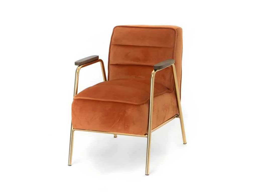 Ce superbe fauteuil Hutch va vous séduire par son confort et sa robustesse. Son piètement en métal doré, ses accoudoirs en bois et son revêtement en velours orange en font un incontournable classique au même titre que le célèbre feuilleton télé !