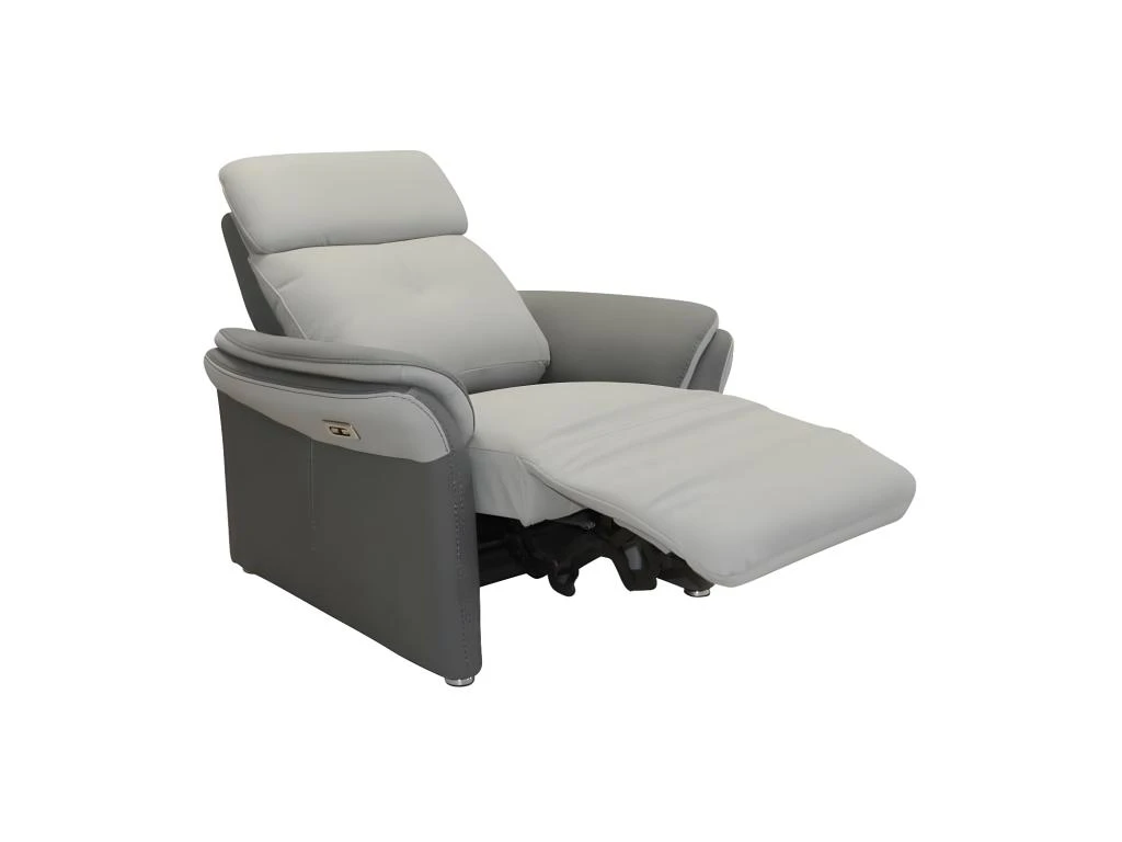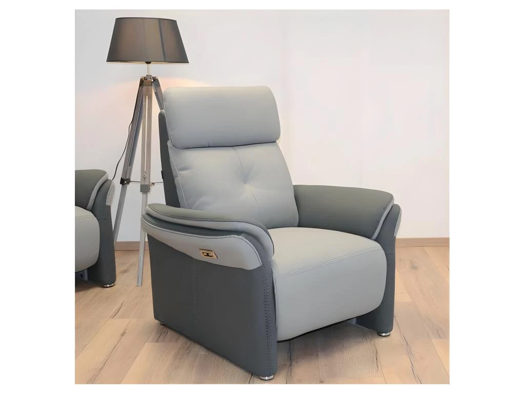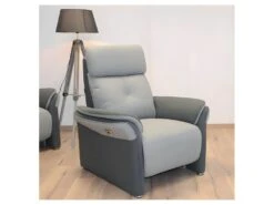 La signature visuelle de ce fauteuil contemporain électrique est soulignée par la mise en oeuvre d’un mariage de tissu Microfibre aspect Cuir très légèrement grainé combinant les teintes Gris Perle et gris Plomb.
