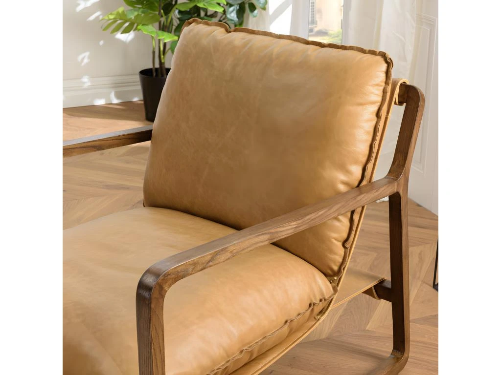 Fauteuil inclinĂ© vintage cuir marron cognac, structure en bois. Dimensions : 74 x 95 x 85 cm. Article en Cuir de vache/FrĂȘne/Mousse.